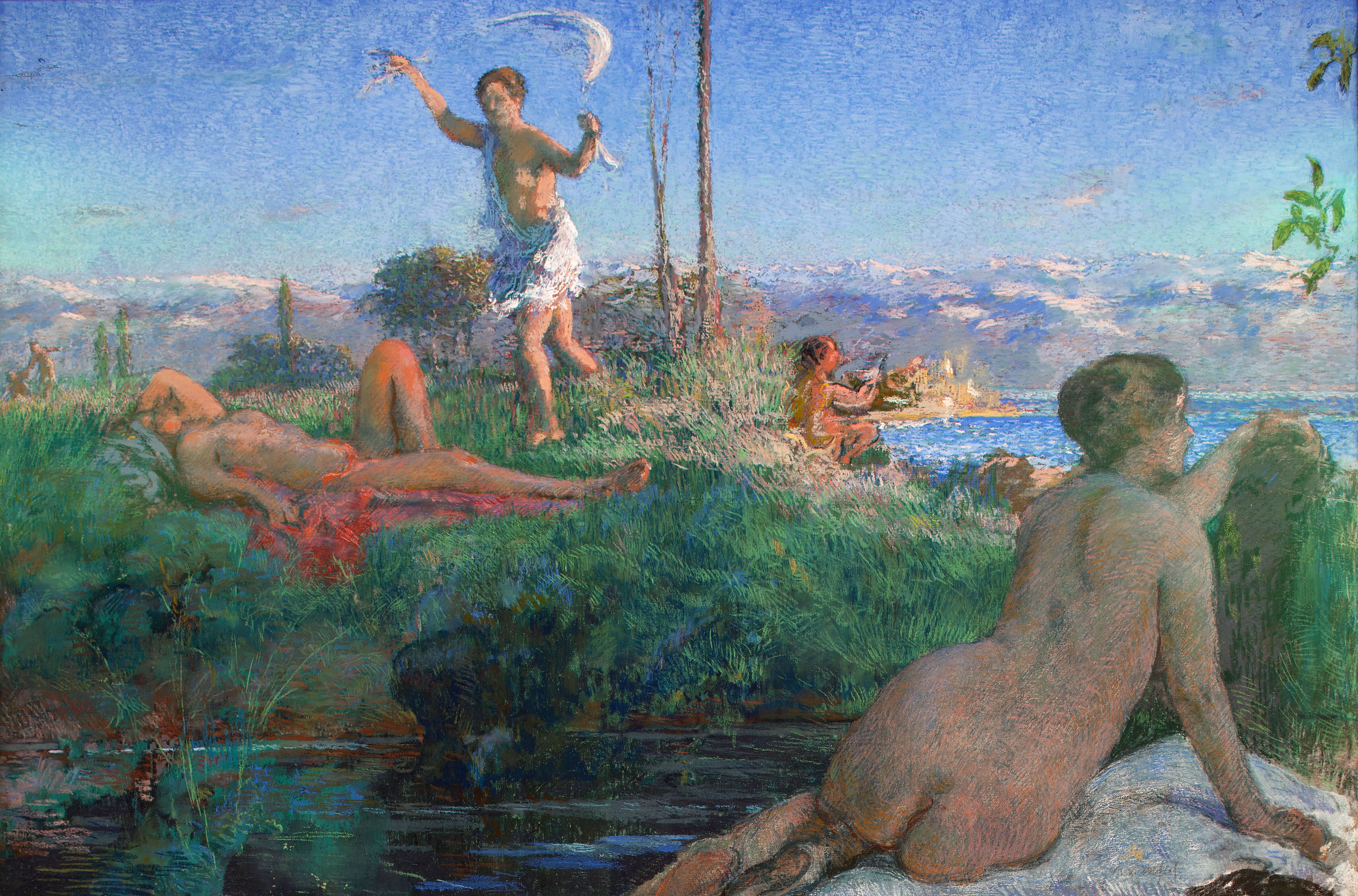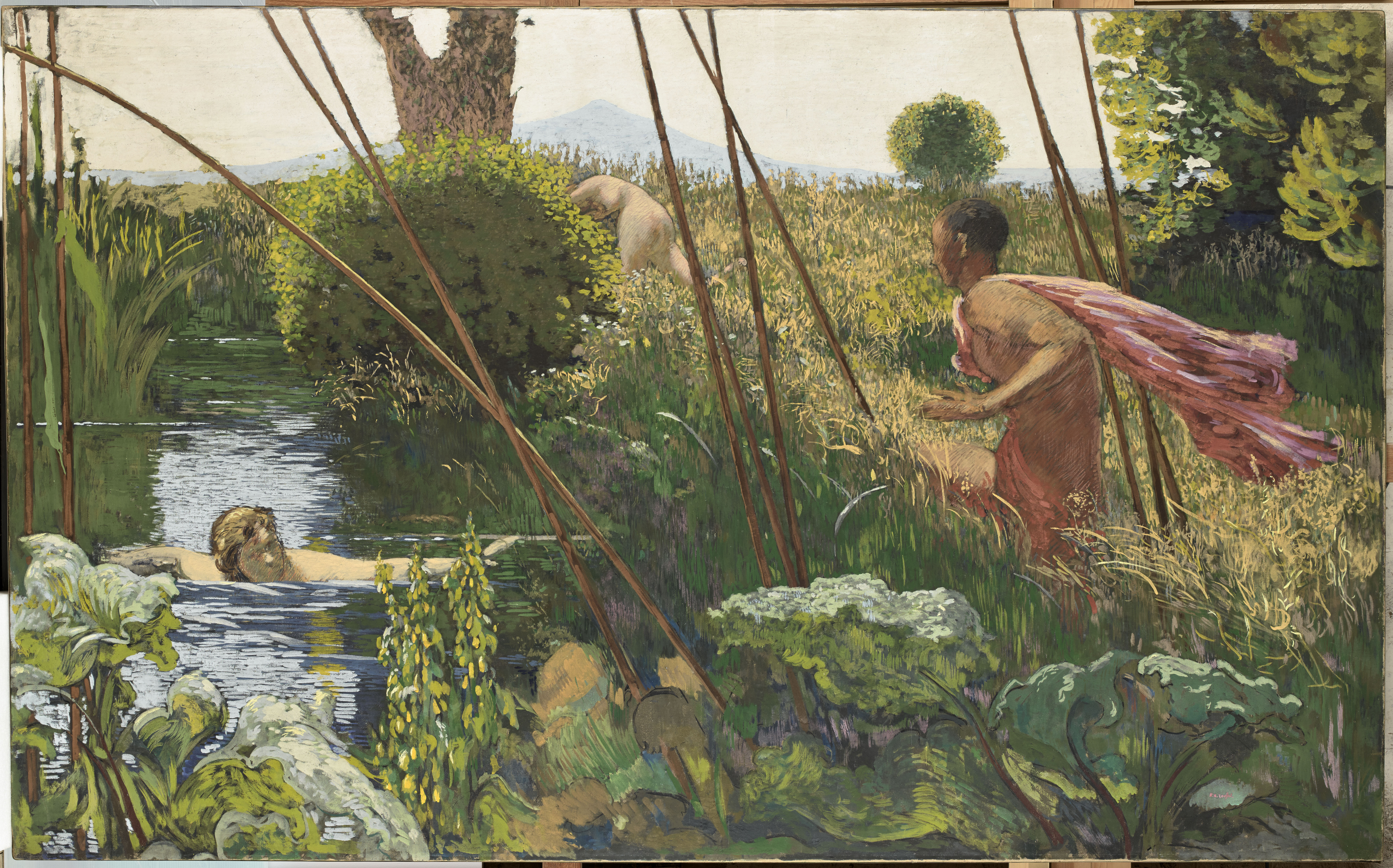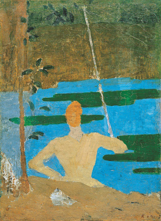 Sous le nom évocateur de “Jardin privé, jardin rêvé”, le musée de Giverny, retrace à travers une vaste rétrospective, l’itinéraire artistique de Ker-Xavier Roussel (1867-1944), et répare ainsi l’injustice par laquelle ce peintre n’avait fait l’objet d’aucune exposition d’envergure depuis celle présentée en 1968, à l’Orangerie des Tuileries. Apparenté d’abord au mouvement nabi, celui qui fut l’ami intime de Bonnard et Vuillard, sut pourtant se frayer, au temps des avant-gardes, un chemin singulier, à la fois novateur et résolument tourné vers le passé, mais marqué d’un bout à l’autre par le désir de célébrer la nature. Réaliste ou idéalisée, apaisée ou sauvage, la nature, dans sa perpétuelle beauté, se révèle toujours sous son pinceau comme une invitation au sacré, un retour au paradis originel, et plus encore, à l’Âge d’Or de l’Antiquité. Lieu d’une réconciliation, elle incarnera aussi dans l’œuvre de Roussel l’espace où se déploie sans entrave le plein élan vital, celui-là même qui commande à la libération des instincts et des pulsions érotiques, et qu’avait célébré peu de temps auparavant, à travers la figure de Dionysos, l’écrivain Friedrich Nietzsche (1844-1900). Son influence sur le peintre est explicitement évoquée dans le parcours de l’exposition. Revisiter les mythes anciens à travers des paysages d’Île-de-France ou du midi, jouer des anachronismes en plaçant côte à côte nymphes lascives et êtres familiers, célébrer l’harmonie retrouvée et la danse cosmique sans cesse recommencée, telles furent à partir de 1898-1899 les principales préoccupations esthétiques de Roussel, tant à travers les grandes commandes publiques, que les formats plus modestes destinés aux particuliers. Souvent comparé à Poussin, Roussel s’inscrit ainsi dans la tradition classique des peintres d’histoire, mais la réinvente à travers une facture nouvelle, marquée par la rapidité de la touche, l’application à suggérer visages et contours sans souci des détails, à préférer la synthèse à l’anecdote, l’ellipse à la précision réaliste, à jouer d’effets néo-impressionnistes pour saisir chaque scène représentée dans sa vivante vibration et restituer le souffle du vent dans les feuillages, l’abandon des corps alanguis, la grâce légère des figures qui s’élancent. Mystères bucoliques : des influences nabis à celle de Puvis de Chavannes“Le Pêcheur”, vers 1890-1891
