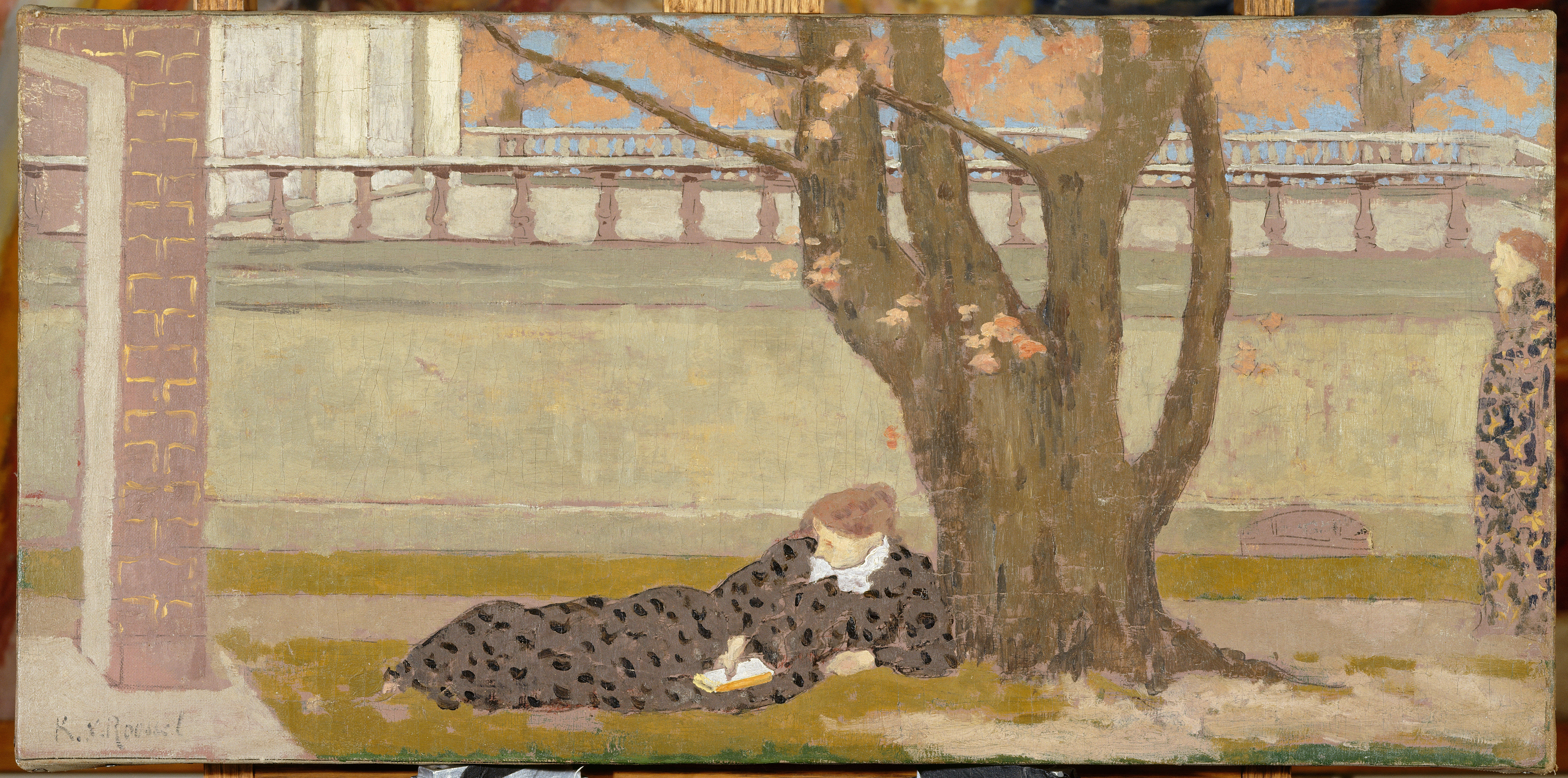 D’abord formé à l’école des Beaux-Arts puis à l’Académie Julian, Ker-Xavier Roussel rejoint le groupe des Nabis, fondé fin 1888 autour de Paul Sérusier et de Maurice Denis. Pierre Bonnard et Edouard Vuillard, avec lesquels il partage alors un atelier rue Pigalle, sont aussi de l’aventure. Comme eux, Roussel fait immédiatement sien ce nouveau langage pictural, dont l’esthétique éminemment décorative, repose sur des aplats de couleur vives, sur de puissants contrastes suggérant seuls la profondeur, sur des cadrages inhabituels, donnant l’impression de saisir la scène sur le vif, dans l’éternité d’un instant toujours neuf. Considéré comme un chef-d’œuvre du genre, son “Pêcheur”, exécuté vers 1890-1891 fait presque ici figure de manifeste.“La Terrasse”, vers 1892
