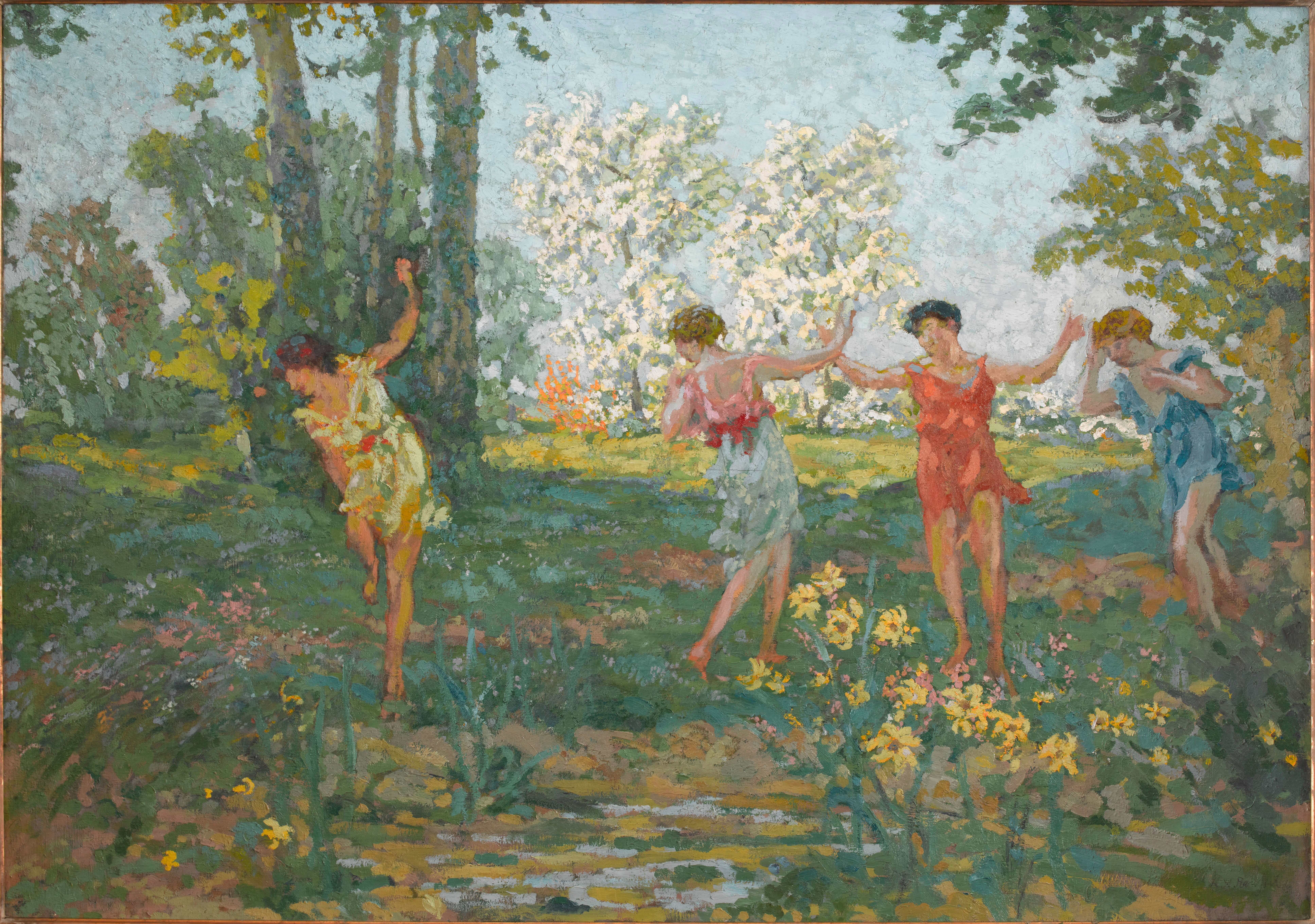 Pourtant, Roussel sait garder son indépendance et demeurant ouvert à d’autres influences, semble parfois établir une distance avec ses propres compositions nabies, à travers les sujets qu’il choisit de traiter. Ainsi dans “Femme et fillette” (huile sur toile, vers 1892, collection particulière), ou encore “L’éducation du chien” (1893, lithographie en quatre couleurs), prédominent les notions d’admonestation et de retrait, sous le regard presque moqueur du peintre. Sensible au symbolisme de Puvis de Chavannes, admirateur des primitifs italiens, Roussel peuple alors nombreuses de ses toiles de femmes mystérieuses, évoquant les âges de la vie, et rappelant, dans des paysages apaisés, l’esthétique ancienne des sacra conversazione. Dédaignant les sujets contemporains de la vie quotidienne, ne s’intéressant pas plus au représentations urbaines, Roussel se tourne résolument vers la nature et l’idéal, ainsi dans “La Terrasse” (1893, huile sur toile, musée d’Orsay), exécutée dans le cadre d’un concours pour décorer la mairie de Bagnolet. Le jeune peintre y participe sans être retenu, mais réalisera quelques semaines plus tard en même temps que Bonnard et Vuillard des décors pour le Théâtre de l’Œuvre. Le motif récurrent de la danse et l’influence d’Isadora Duncan“Eurydice mordue par un serpent”, vers 1913