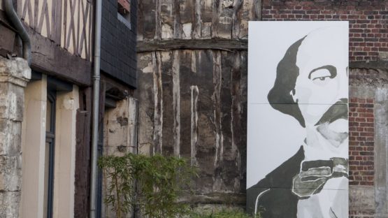 In the courtyard, we exhibit a work by painter Hastaire from Flaubert’s book in its colours and entitled Portrait of Flaubert, printed on canvas and attached to an outside wall of the hotel.